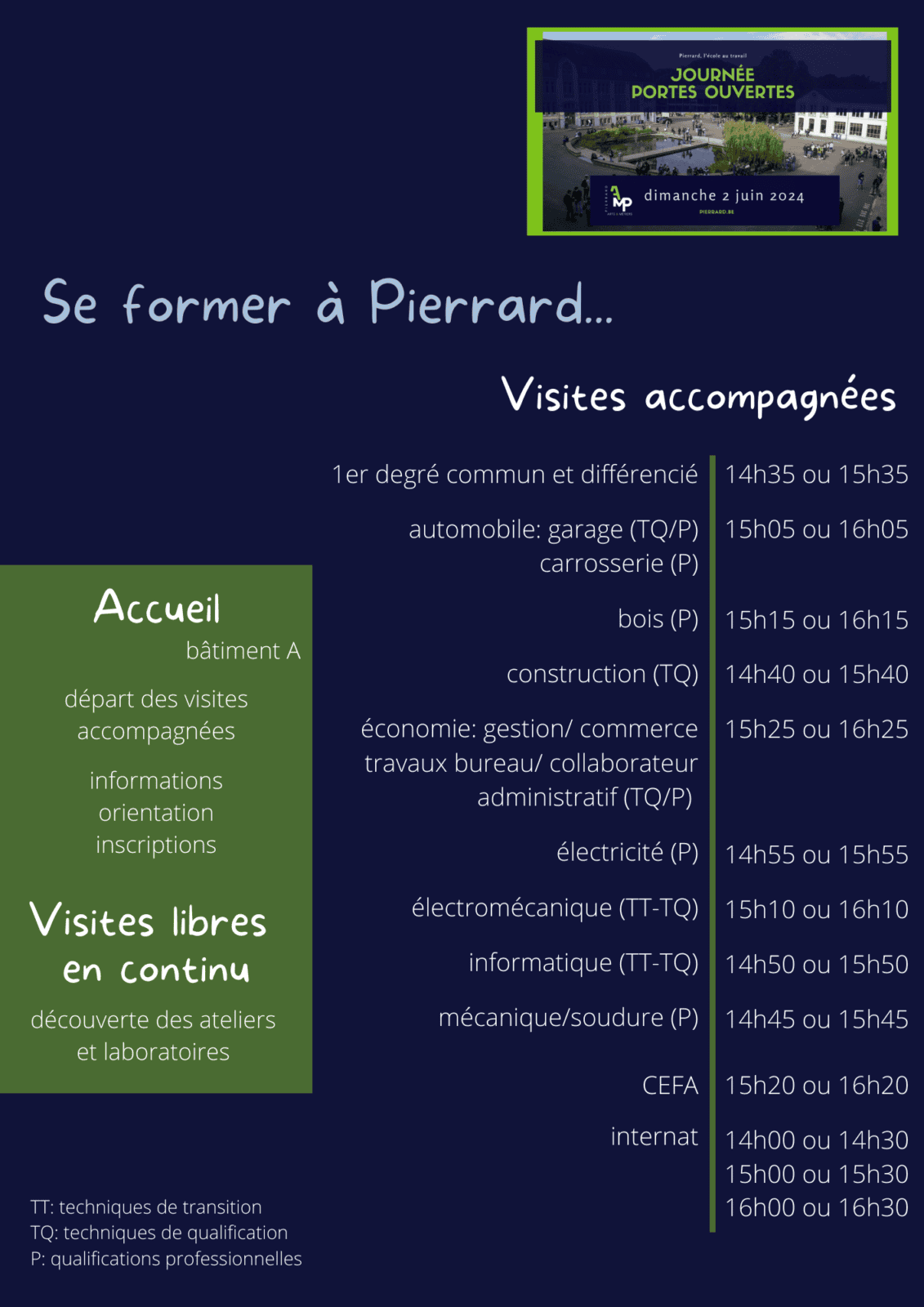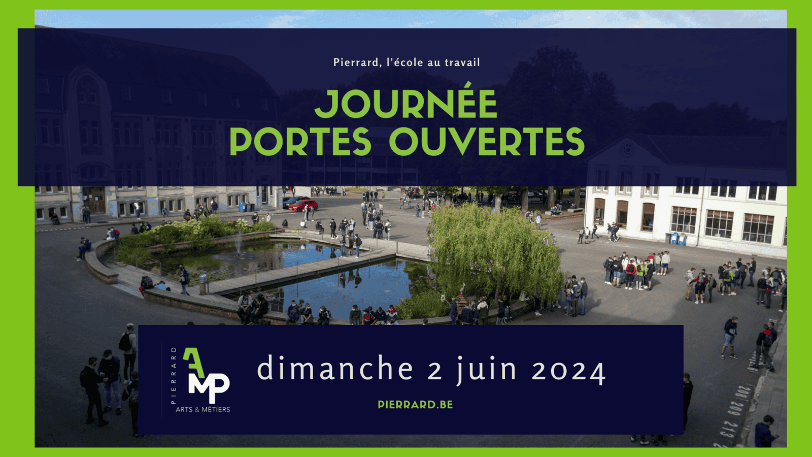 Les Aumôniers du Travail, l’Institut des Arts et Métiers, la Haute Ecole de Namur-Liège-Luxembourg, les directions, le personnel, les élèves et les étudiants des deux instituts de Pierrard ont le plaisir de vous inviter avec vos proches à leur journée portes ouvertes organisée le dimanche 2 juin 2024.